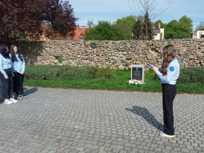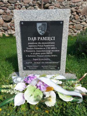 W piątek, 12 kwietnia uczniowie klasy policyjnej uczestniczyli w szczególnej lekcji w terenie, którą przygotowały dwie uczennice kl. I LP: Roksana Szpalerska i Julia Jaskólska. Podczas uroczystej zbiórki na pl. gen. Maczka, w obecności całej klasy uczennice złożyły wiązankę kwiatów pod Dębem Pamięci i tablicą upamiętniającą aspiranta Teodora Fabisiaka, funkcjonariusza Policji Państwowej, który w kwietniu 1940 roku został zamordowany przez NKWD w Kalininie (Twerze) i spoczywa na Polskim Cmentarzu Wojennym w Miednoje – największej na świecie policyjnej nekropolii ( pochowanych jest tam prawie 6 tysięcy polskich policjantów – ofiar Zbrodni Katyńskiej). Uczennice przygotowały i odczytały na zbiórce biogram aspiranta Teodora Fabisiaka.