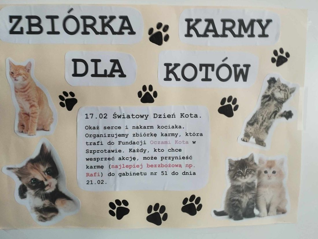 Z okazji Światowego Dnia Kota w szkole odbyła się zbiórka karmy zorganizowana przez klasę 3 LO na podopiecznych Fundacji Oczami Kota w Szprotawie. Dzięki zaangażowaniu młodzieży udało się zebrać w sumie ok. 30 kg karmy, która trafiła do kotów będących pod opieką Fundacji. Dziękujemy!